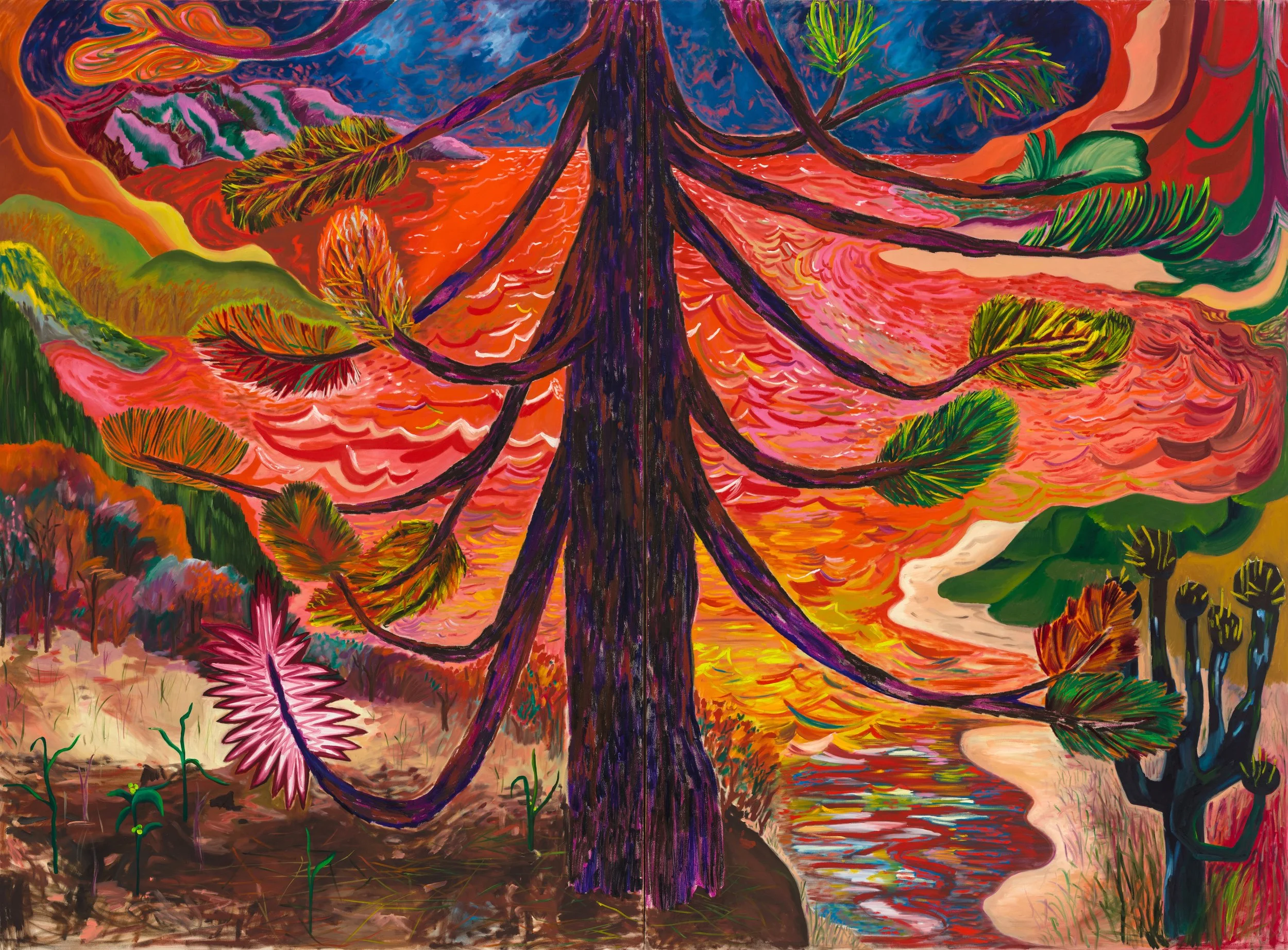 Shara Hughes Growing Pains, 2022 Oil, acrylic and dye on canvas, 221 x 198.1 cm / 87 x 78 in, Courtesy the artist, Pilar Corrias, London, David Kordansky Gallery, and Galerie Eva Presenhuber
